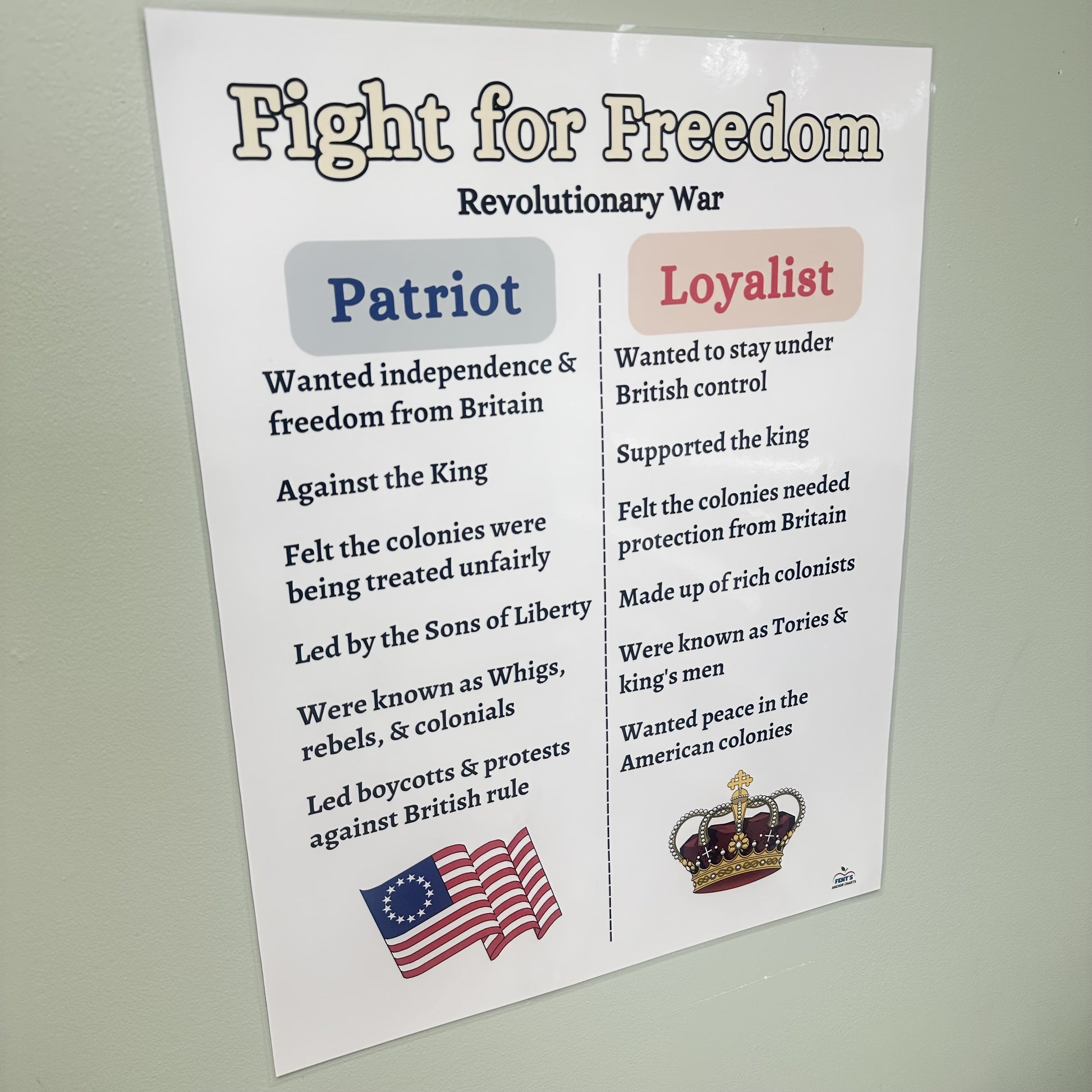 Teach the American Revolution with this Patriots vs Loyalists laminated anchor chart, perfect for middle school and upper elementary social studies classrooms. This poster offers a clear side-by-side comparison of the beliefs, characteristics, and motivations from both sides of the Revolutionary War. It’s designed to support social studies standards and enhance student understanding with bold visuals and easy-to-read text.
