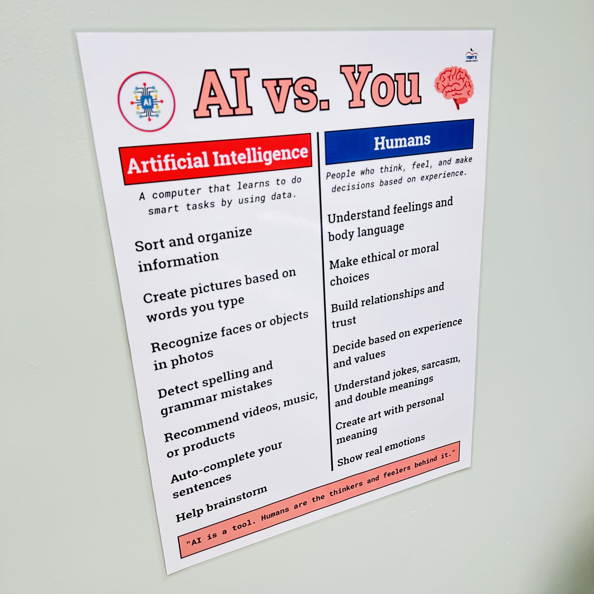 Looking for a powerful, student-friendly way to explain artificial intelligence in your classroom? This laminated “AI vs. You” anchor chart helps kids compare what computers can do—and what only people can do. Great for digital citizenship, STEM learning, or tech bulletin boards!