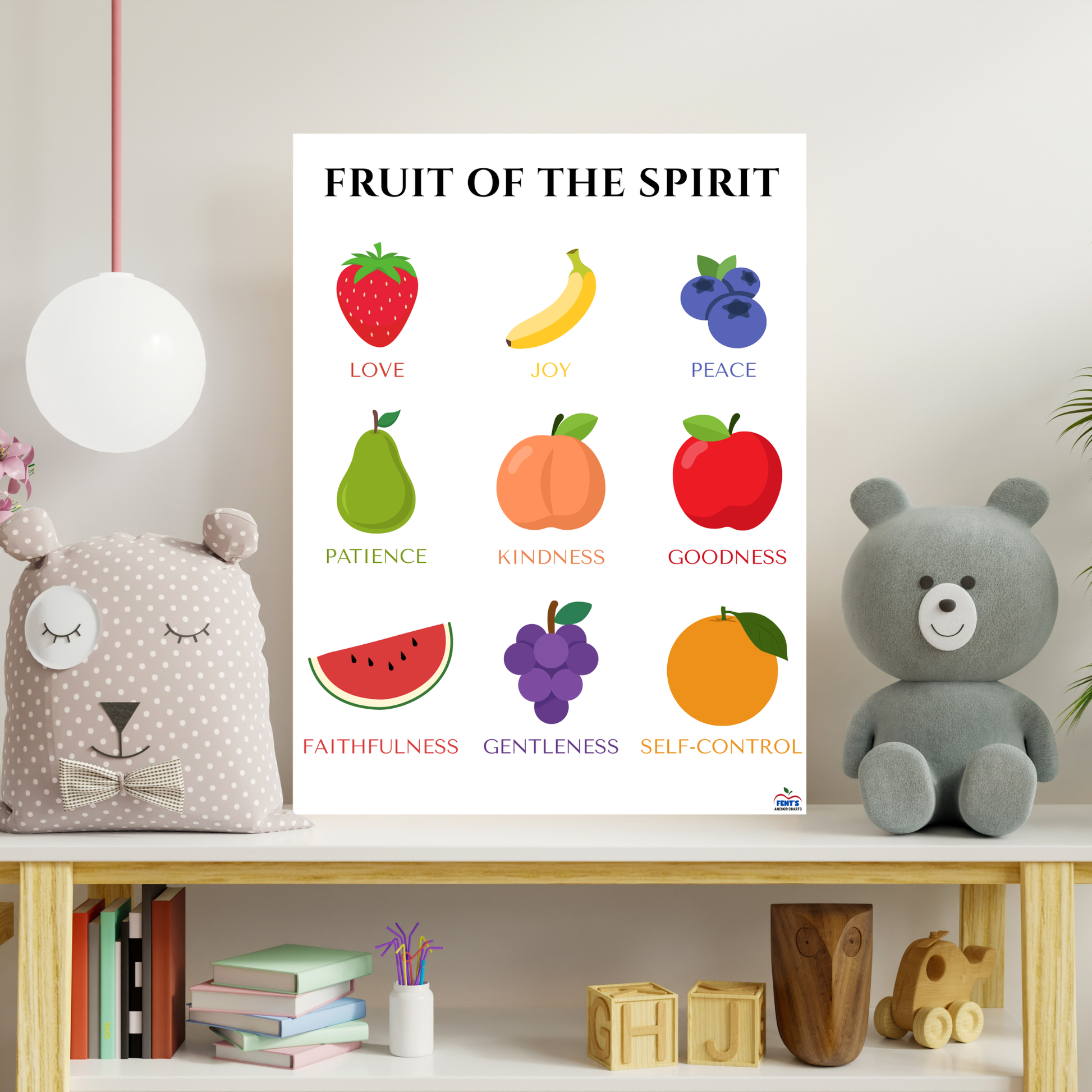Introduce biblical character traits with a calm, timeless design using this 'Fruit of the Spirit' laminated poster featuring simple fruit illustrations. Created for families who prefer a minimalist and peaceful look, this Christian wall art helps children learn love, joy, peace, patience, kindness, goodness, faithfulness, gentleness, and self-control in a visually gentle way.