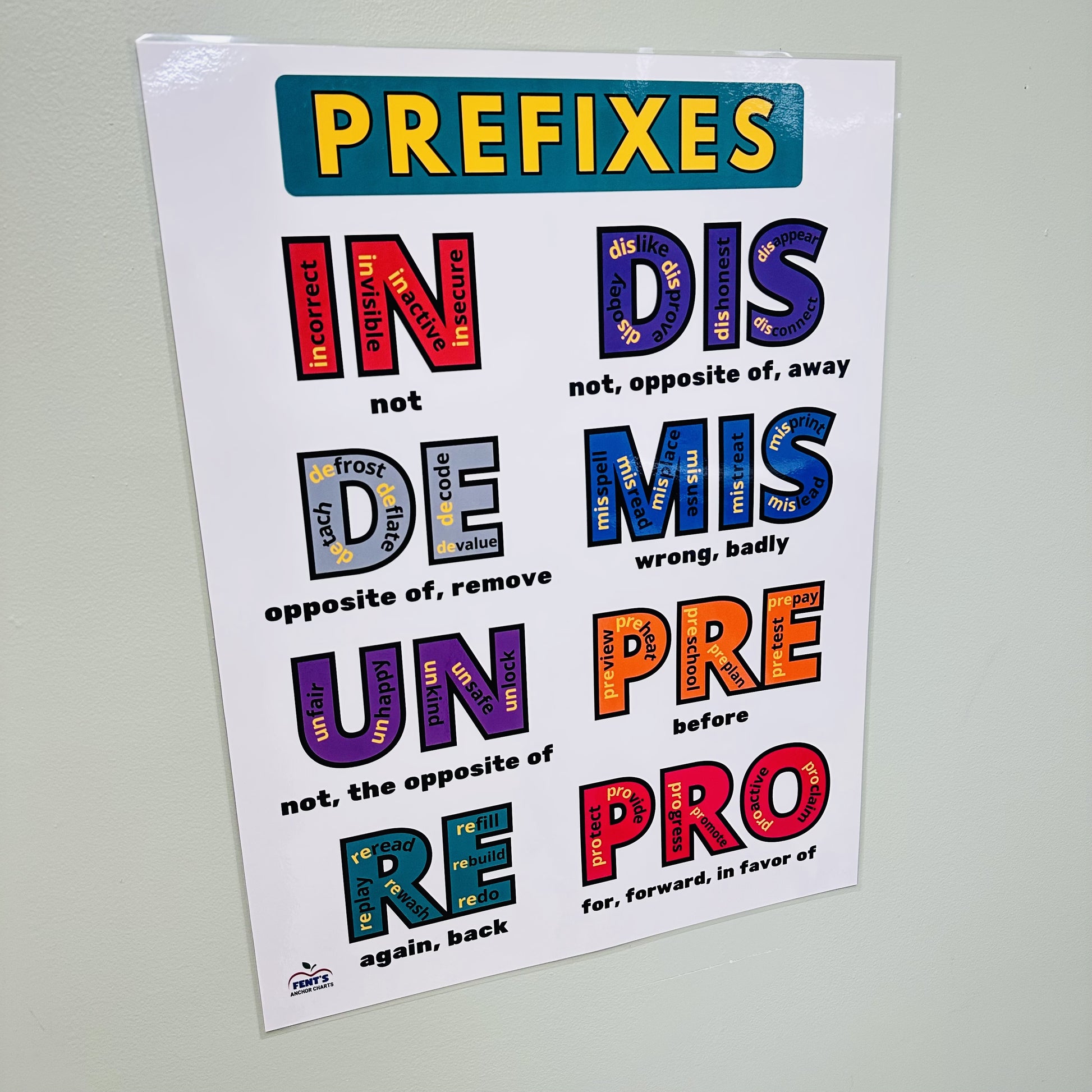 Help your students learn common prefixes with this easy-to-read 'Prefixes' laminated anchor chart! This ELA classroom poster outlines the eight most common prefixes: in, dis, de, mis, un, pre, re and pro—using kid-friendly language and visuals. Perfect for your ELA classroom, bulletin board, writing center, or small group instruction area.