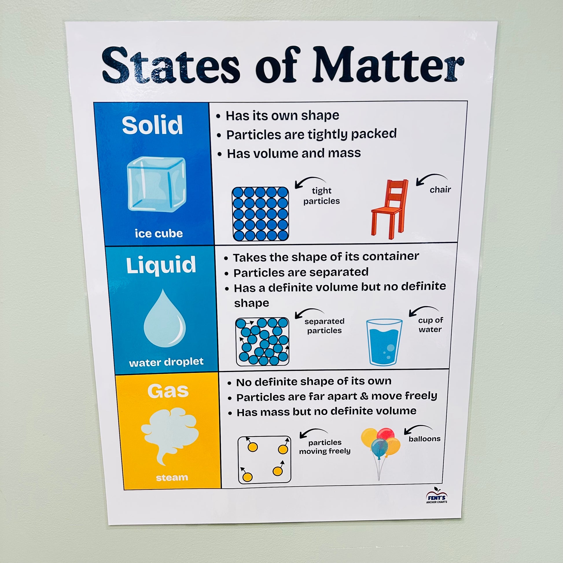 Make science visual and easy to understand with this 'States of Matter' laminated anchor chart! This colorful, kid-friendly poster helps students learn the differences between solids, liquids, and gases — including particle movement, shape, and volume. Perfect for elementary and middle school science classrooms, this chart reinforces key concepts in physical science and makes your classroom wall both educational and engaging.