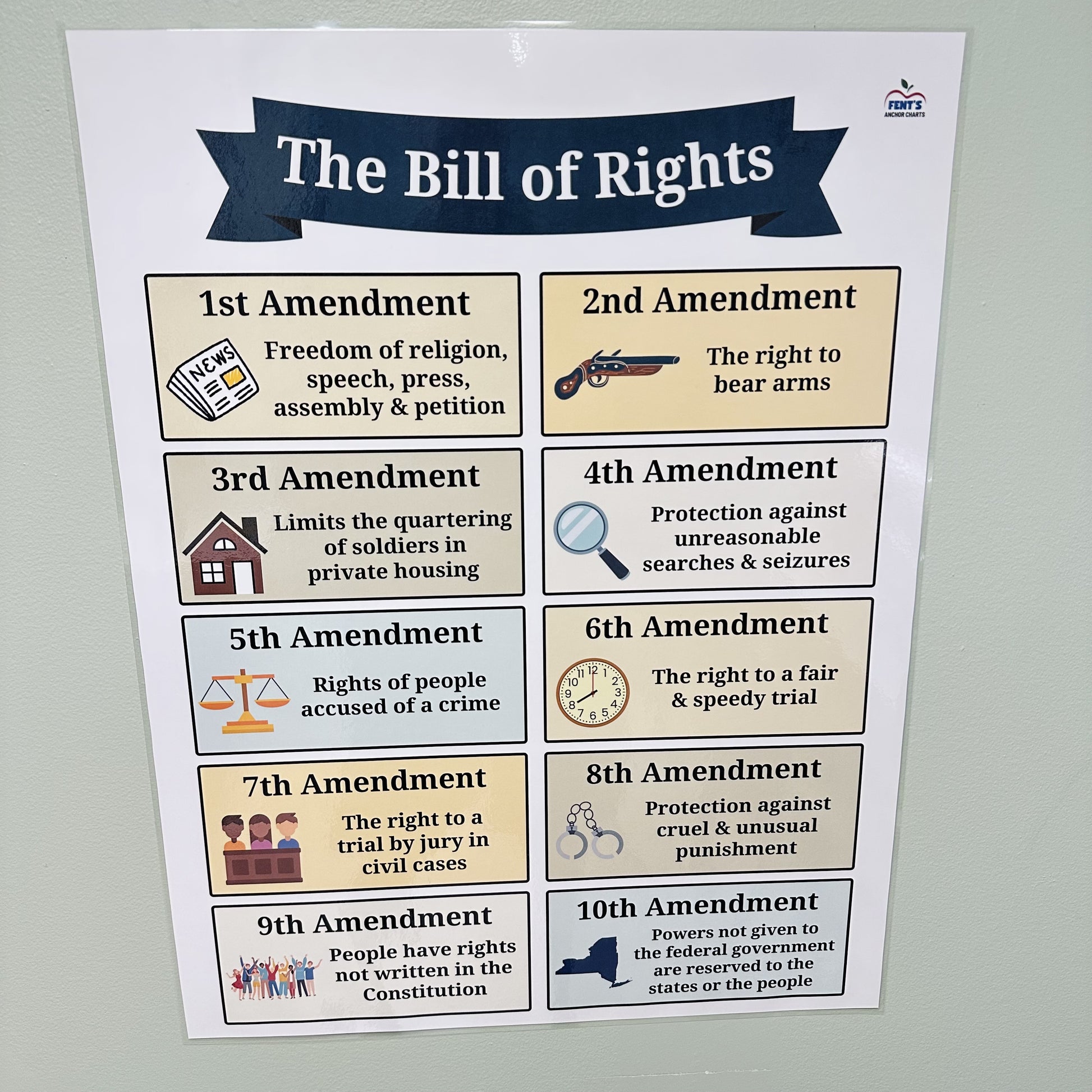 This laminated 'Bill of Rights' anchor chart – High School Edition presents all 10 Amendments using precise, textbook-aligned language appropriate for grades 9–12. Designed for American History and U.S. Government & Civics classrooms, this chart serves as a clean, year-round reference students can rely on.